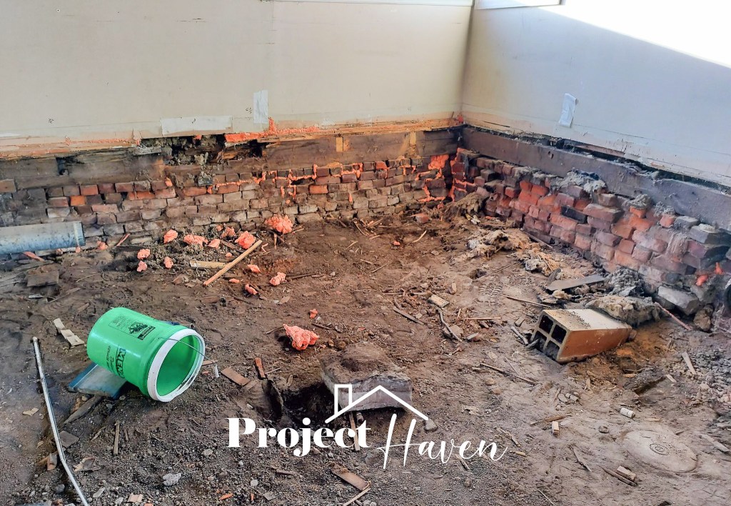 We cleaned up the now-exposed crawlspace, then dug down to a consistent depth that will be reasonable to crawl in when the floors are back on.