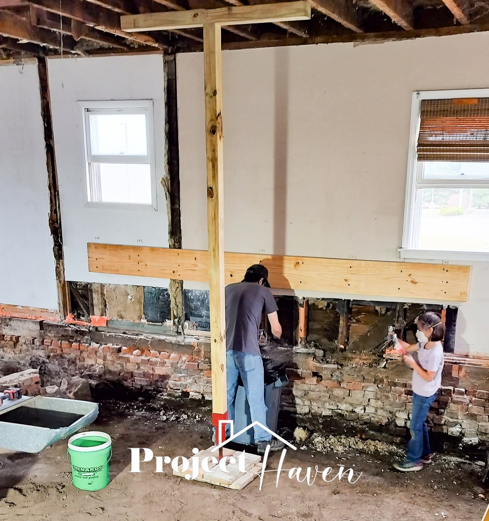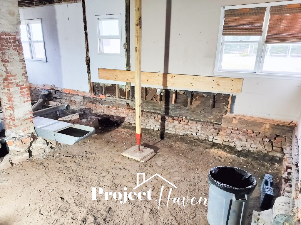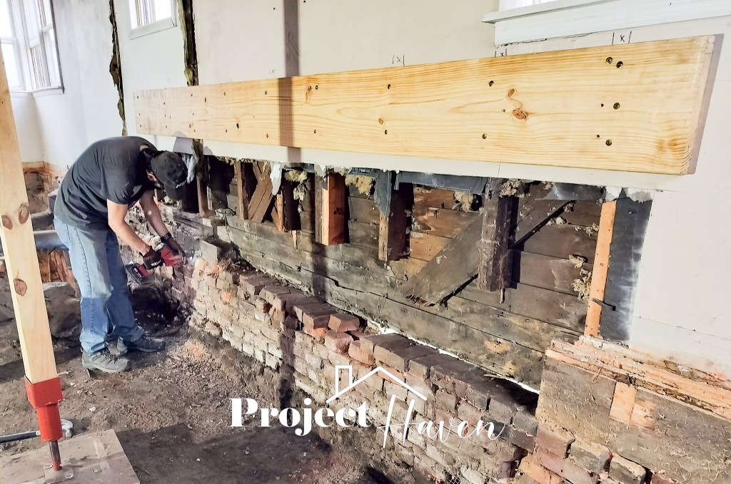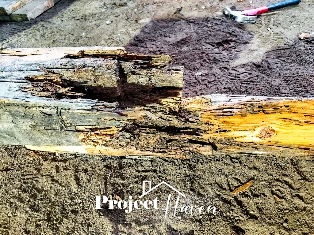 then carefully removed a rotten beam from the top of the crawlspace foundation.