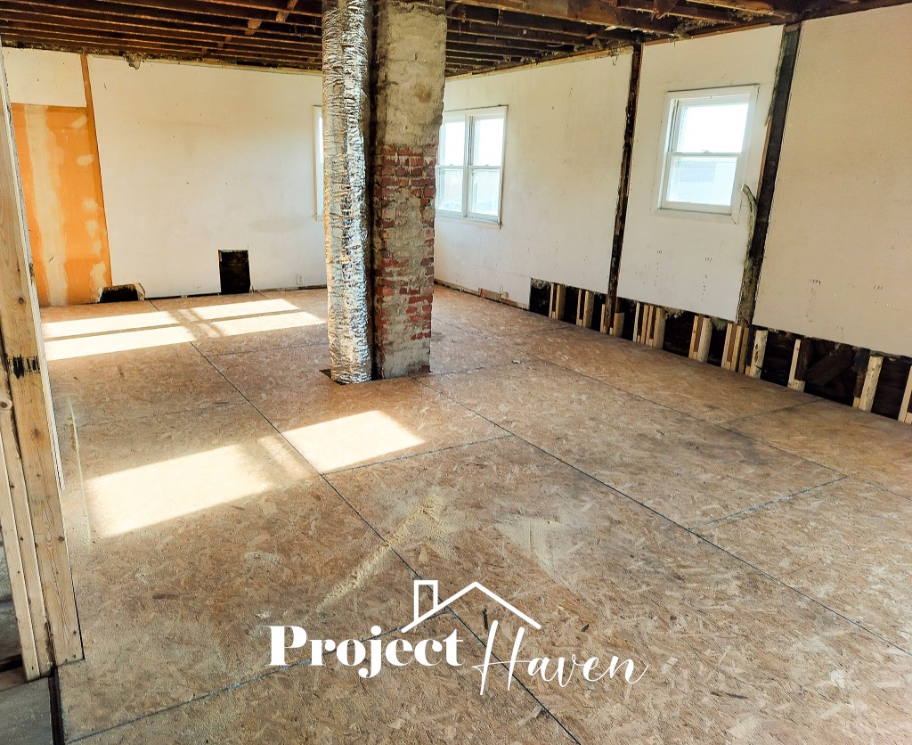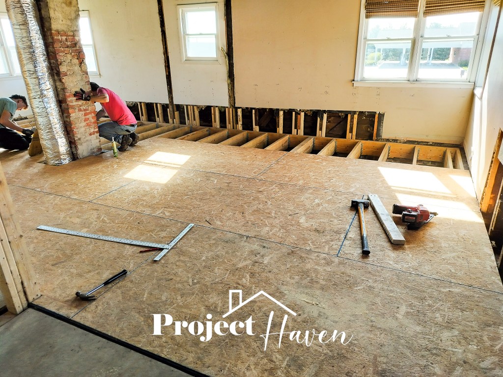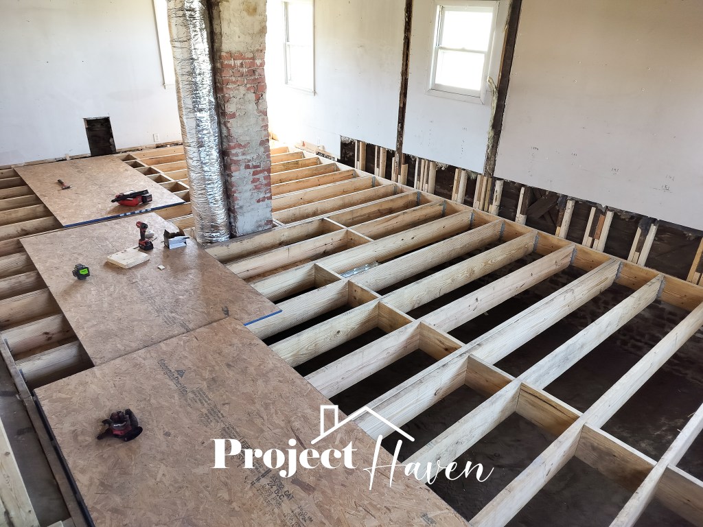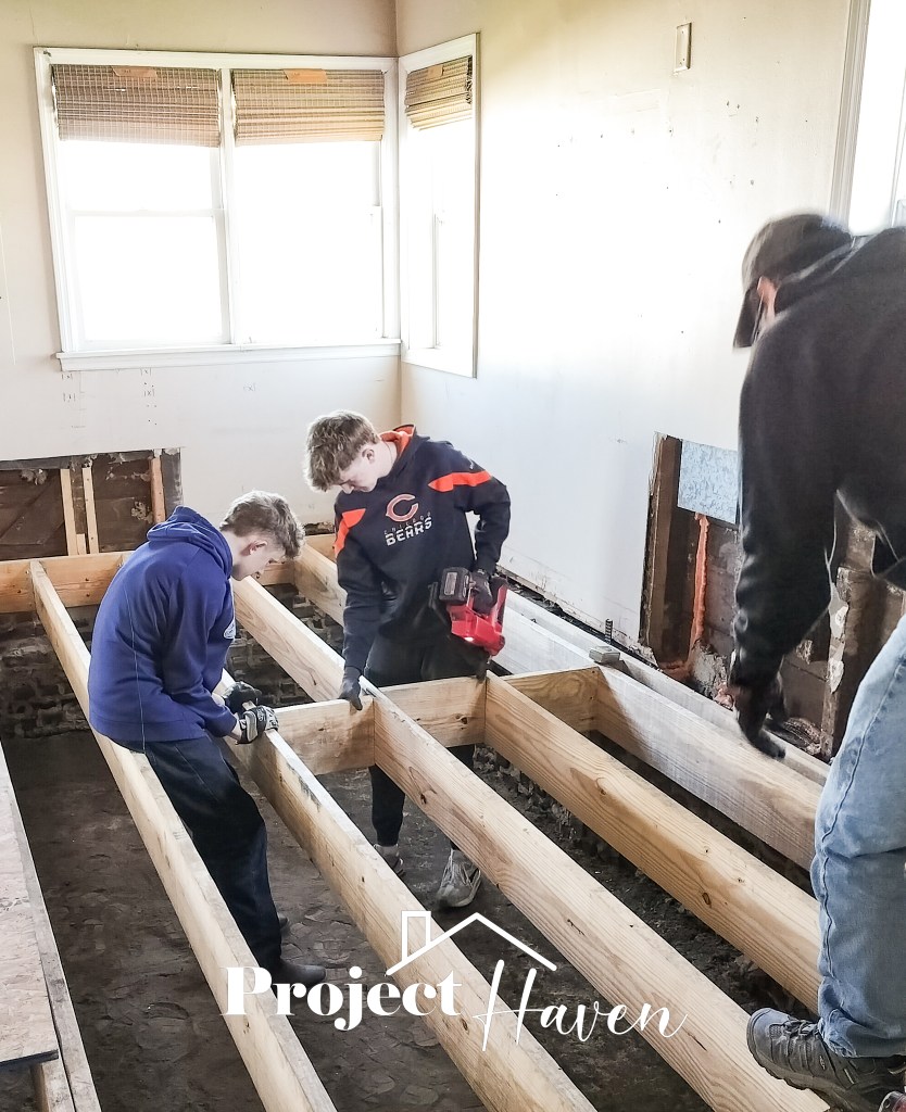 The guys started by bracing the joists, an important step for side-to-side stability before putting the subfloor down.