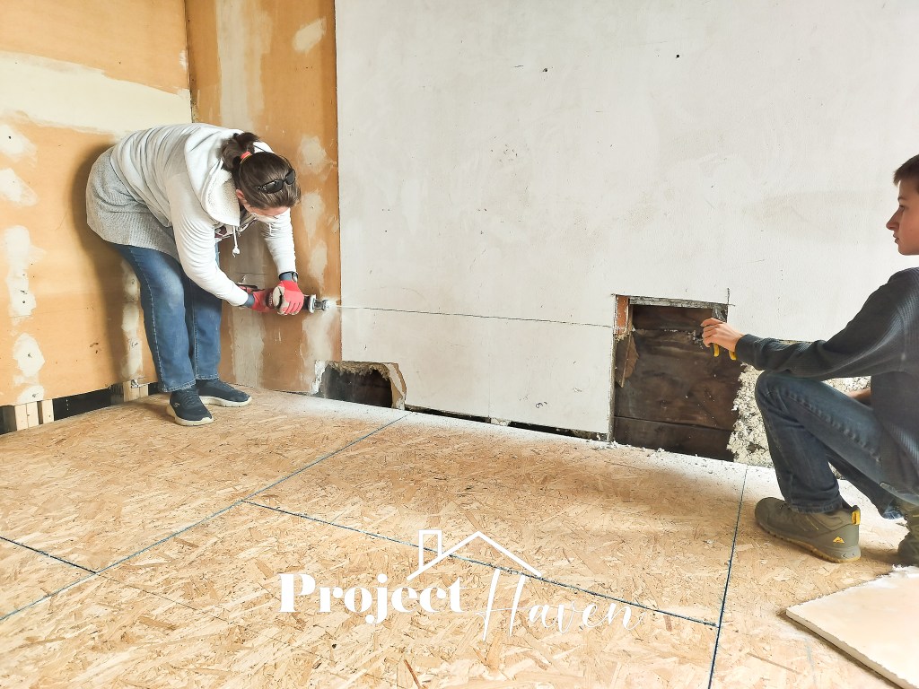 Esther broke out the sawzall and started removing the bottom of the old drywall around the master bedroom/living room area at a consistent height (yay laser levels!), to prepare for new electrical installation.