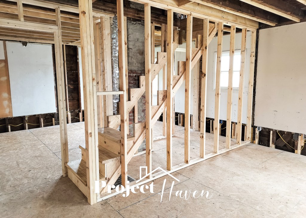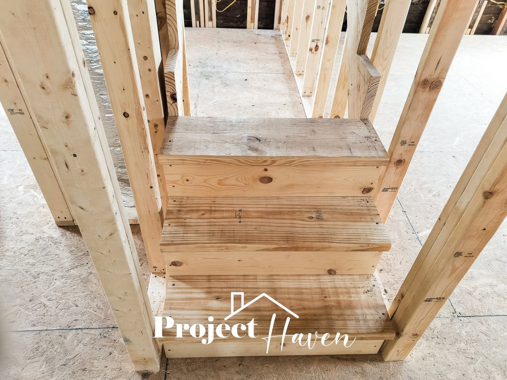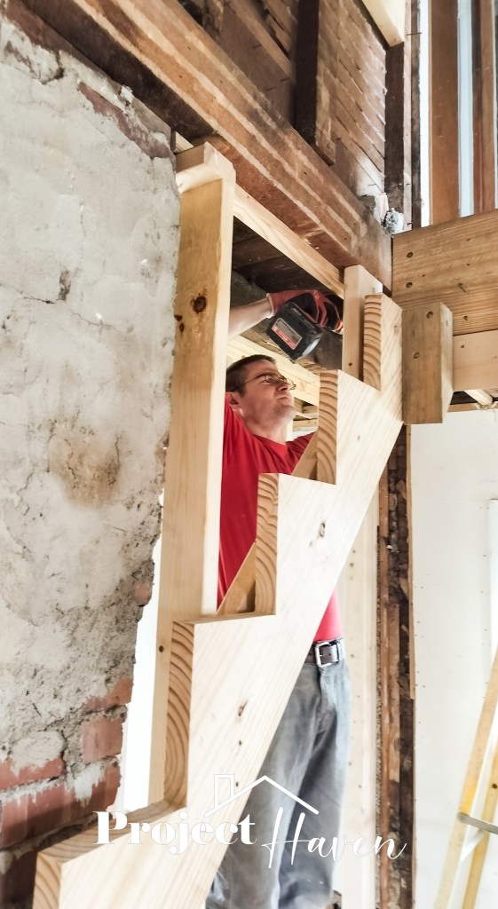 [Yes, those are visible screws in the stair boards. The plan is to carpet the stairs, so that shouldn’t matter.]