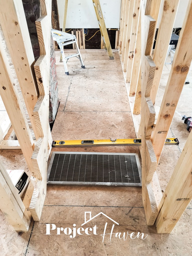 Once the stringers were up, Matt reconsidered the proposed HVAC system. Originally the HVAC company wanted this grate at the bottom of the stairs where it would be walked on all the time.
