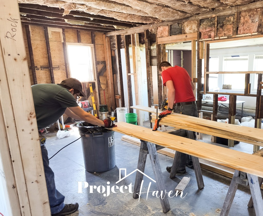 Now that we were able to walk on the second floor again, we were a little disappointed in the north bedroom floor strengthening. The “swim” was better, but it was still there, more than Matt had hoped. So the guys used the nail gun and drove a bunch of nails to attach the floor to the new joists…and it still didn’t improve significantly. So they then took structural (basically means just bigger and stronger than normal) screws and screwed the old floor/ceiling joists to the new ones in more places. Boom. Problem solved.