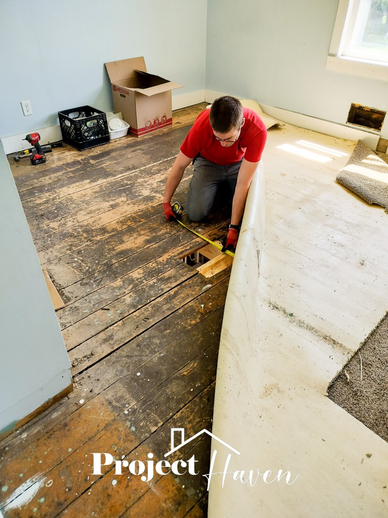 Now that we could get to the upstairs, we were able to start dealing with things like the landing and various holes. This one was left from a grate in the floor.
