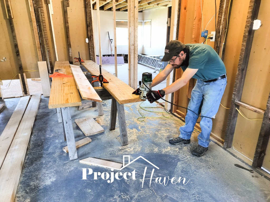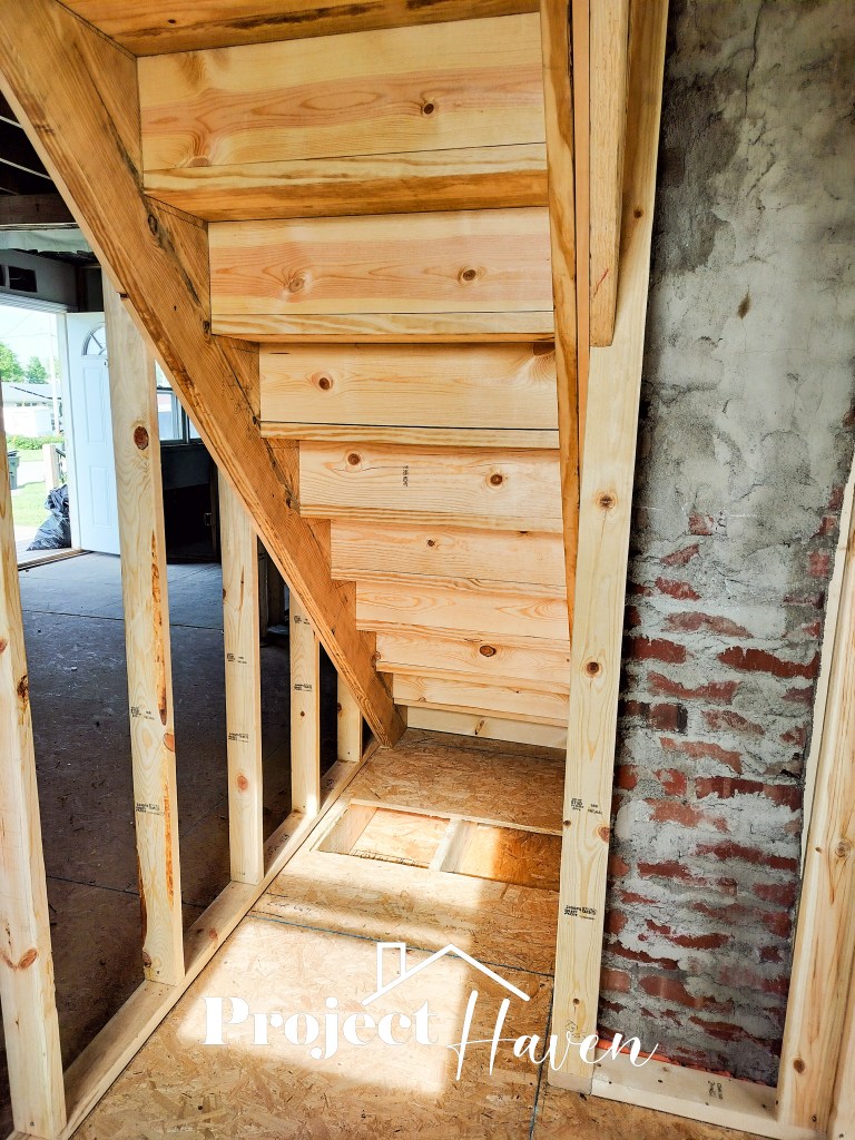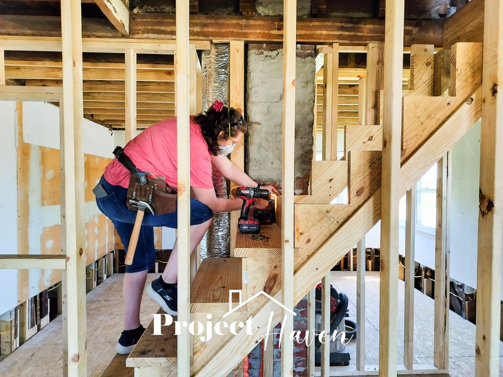 The nosing is the smooth rounded edge on the front of the tread. The cost of each pre-nosed tread was about the same as one long board that three treads could be cut out of. Matt already had a router, so we nosed our own stair treads! A couple of them aren’t perfect, but it’s a cool feeling that we did them ourselves and learned a new skill.