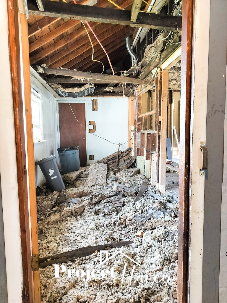 Well, see…Matt was climbing around in the attic above the mudroom several weeks ago to deal with some electrical when the entire ceiling dropped several inches under him.