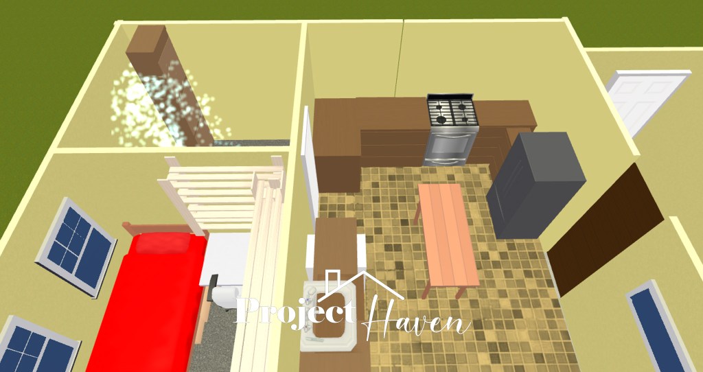 The bathroom was on the east side of the kitchen. To the north of the kitchen and bathroom was a bedroom in the back corner, and an odd oversized entry that was going to be difficult to use in any efficient way.