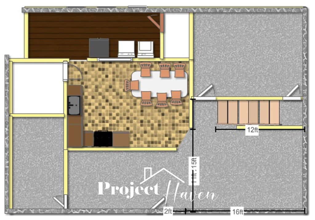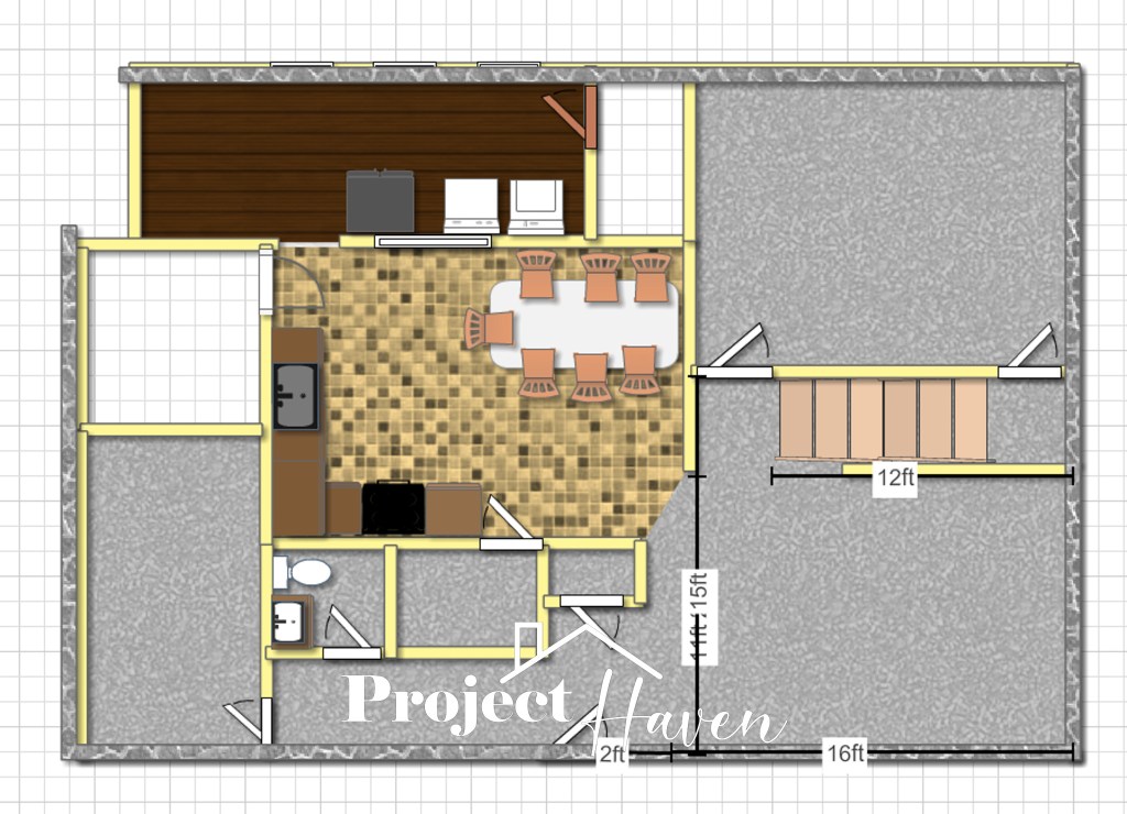Ohhh, the kitchen. I had been wondering how on earth we were going to fit our large family of seven into the cramped eating space. This change would expand the kitchen/dining to be huge, and lovely. And let in more light! The kitchen had no exterior walls, and therefore no windows. I hate a lack of natural light in my interior spaces. Exterior walls meant maaaaybe windows…