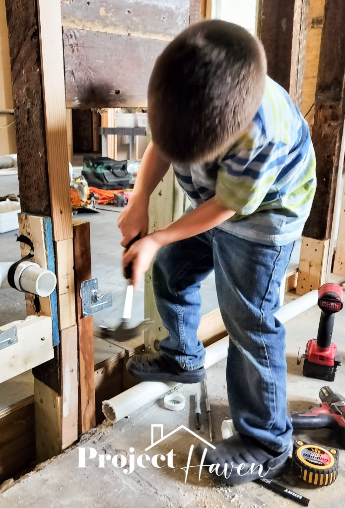 Matt asked the kids and me to prep the mudroom for electrical by demolishing 16 inches up on the mudroom wall–the last remaining untouched wall in the downstairs. Then I started putting in receptacle boxes on that wall…