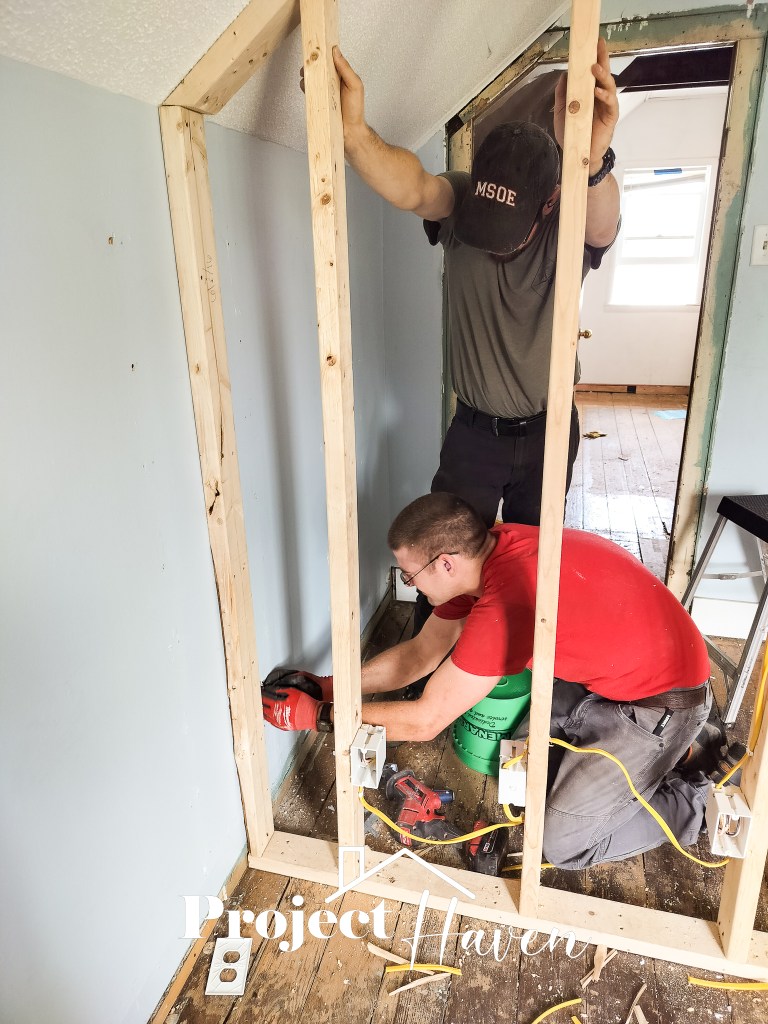 The guys joined forces on wiring receptacles once Matt was done with the plumbing. The old-work receptacles in the upstairs walls weren’t fun, as we didn’t renovate those walls.