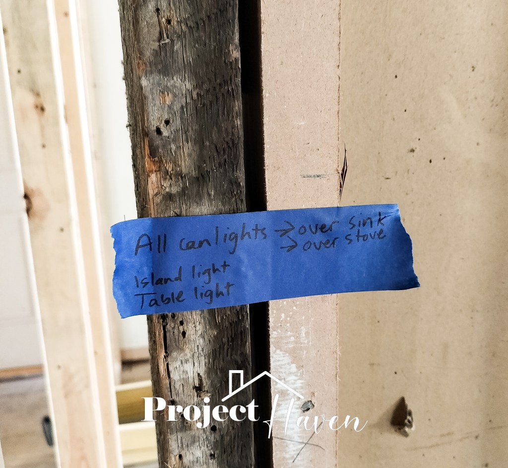 When I got back, I worked on planning out lights and switches, leaving cryptic confusing messages on blue masking tape in the approximate light switch locations.