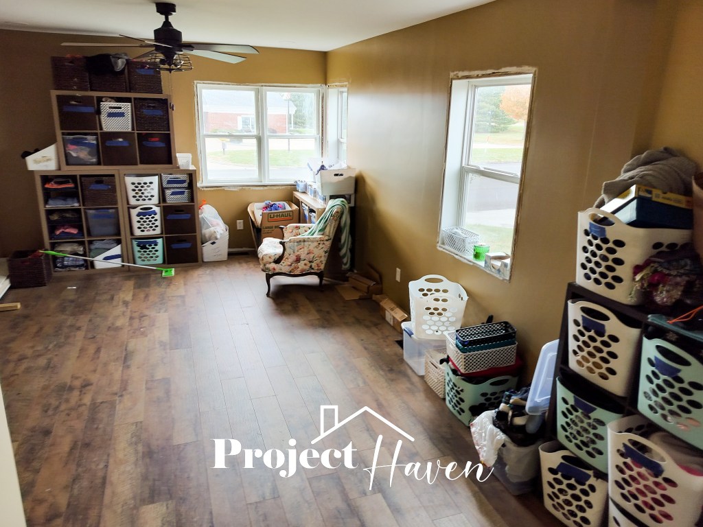 Moving “helpfully” coincided with seasonal clothing changeover. The first step once we finished packing up at the old habitation and arrived at our house was to clear out the piles and bins of clothes in the living room to make space for unloading furniture.
